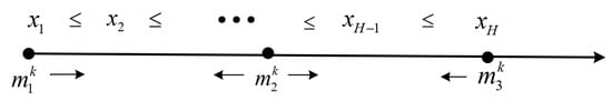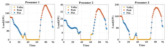 Taking prosumer k as an example. Firstly, we define , , , . Then, the absolute values of the difference between the net load value of each time and , and are calculated respectively. According to the principle of shortest distance, three periods are divided, as shown in Figure 2. The specific establishment criteria are as follows:
