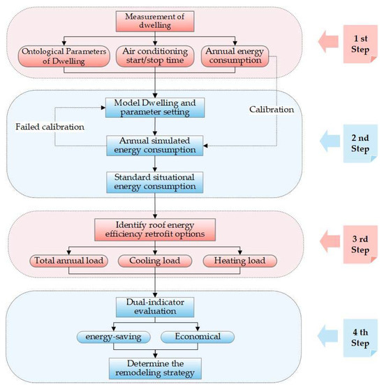 To begin with, an examination was conducted on the electricity usage of every dwellinghold in the traditional dwellings to determine the precise level of electricity consumption in their original condition. The EnergyPlus program was utilized to digitally model the key spatial aspects, geometric information of the enclosure construction, and thermophysical parameters of the traditional dwellings. Second, we made calibration adjustments between the actual and simulated electricity consumption levels to enhance the accuracy of the model data. Then, we built and simulated each energy efficiency retrofit method in EnergyPlus to derive the cooling and heating energy consumption for each method. Finally, we calculated the energy-saving rate of each retrofit method according to Formula (1).