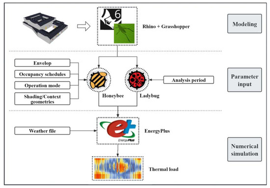 This study simulated the energy consumption of a traditional residential dwelling using EnergyPlus 9.5.0 (U.S. Department of Energy (DOE) Building Technologies Office (BTO), Washington, DC, USA). It constructed a 3D parametric model using Rhinoceros 3D and a battery block engine using Grasshopper 1.0.0007. The engine assigned the original condition of the building to the model based on parameters such as building spatial composition, envelope characteristics, electrical equipment, air-conditioning start/stop times, and indoor/outdoor environments. It then obtained the building energy consumption values through simulation and analysis (Figure 2). Honeybee, a Grasshopper plug-in, is an EnergyPlus-based tool that can simulate the energy consumption of various buildings [38]. This study calibrated the input parameters through field surveys and measurements to make the simulation results match the actual usage of the buildings. In addition, the physical condition of the building can be measured and verified by means of artificial intelligence [39].