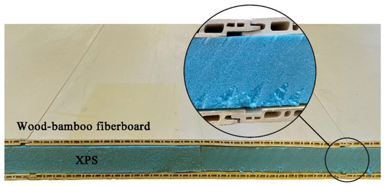 This experiment enhances the wall’s thermal insulation performance by adding an XPS board between two layers of bamboo wood fiber board. It wraps the XPS board with a bamboo wood fiber board to form a composite insulation board (Figure 4). The reasons for wrapping the bamboo wood fiber board outside the XPS board are the following. First, the two materials have good thermo-physical properties. Second, the synthetic material can be produced by mature technology. Third, condensation in hot summer and cold winter climates can lead to moisture accumulation on XPS boards, resulting in issues like deformation, shedding, reduced thermal resistance, and compromised thermal insulation performance and durability. The bamboo wood fiber board can act as an air barrier, preventing the internal XPS board from moisture and mildew [43], reducing maintenance costs, and extending their service life. This maximizes the thermal insulation effect of the insulation layer. Fourth, XPS boards are very flammable and emit dense black smoke and noxious fumes, posing a significant safety risk when utilized in wood structures without additional fire protection. The fire rating assessment test standard for construction materials (GB8624-2012 [44]) categorizes bamboo wood fiber board as belonging to the B1 level, indicating its high flame retardant capabilities that effectively inhibit flame spreading and burning. Using bamboo wood fiber board to encase XPS board can act as a fire retardant for the XPS board. Fifthly, the bamboo wood fiber surface is more suitable for installing metal components and fixing the roof. Insulation boards added to the roofs of wood-structured traditional dwellings increase the stress on the timber beams. If the traditional dwelling requires further strengthening, consider using carbon fiber-reinforced polymer panels [45] to enhance the flexural strength of the timber beams or eco-friendly sawdust concrete [46] to improve the walls’ robustness and boost the building’s load-bearing capacity.