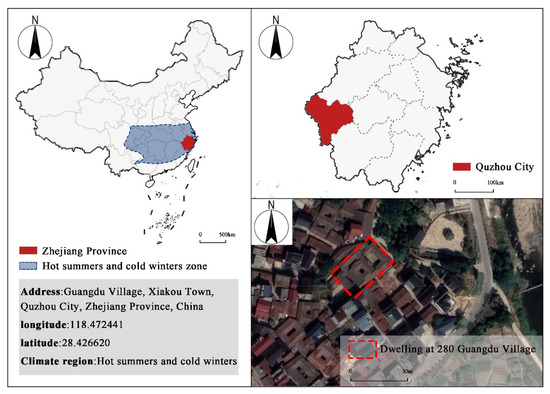 The study focused on analyzing the traditional dwelling No. 280 located in Guangdu Village, Quzhou City, Zhejiang Province, China. This study chose Dwelling 280 in Guangdu Village, Zhejiang Province, China, for three reasons. First, the dwelling is well preserved and undamaged. Second, the presence of two families in the dwelling makes it easier to measure the building’s physical characteristics, energy usage information, and occupants’ living conditions. Third, the dwelling exemplifies the traditional wooden dwellings in hot summer and cold winter regions and can serve as a reference for energy-saving roof retrofits for other dwellings in this climate zone. The geographical position of the dwelling is depicted in Figure 5.