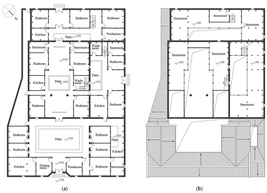 Plan of the traditional Dwelling No. 280. (a) Ground floor plan; (b) Two-level plan.
