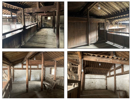 The dwelling is a wood-structured traditional building arranged in a courtyard layout. It was constructed during the Qing Dynasty, precisely 243 years ago. The entire floor area of the dwelling measures 887.5 square meters. Historically, the residence accommodated up to 17 families. The present state of the residence is depicted in Figure 6. Figure 6a displays the entry of the home, while Figure 6b showcases the roof. The primary materials used for the exterior enclosure of the dwelling consist of brick and wood panel walls. The material on the ground is compacted soil known as rammed earth. The roof is a pitched structure adorned with tiles, which serves as a characteristic adaptation to the local subtropical monsoon environment characterized by high temperatures and rainfall in summer and low temperatures and rainfall in winter.