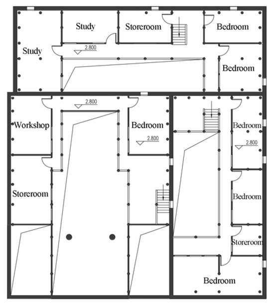 To increase the living area of this dwelling, the study group utilizes bamboo wood fiber boards to divide the second-floor space based on the current state of development in the local rural area. This approach maintains the historical look of the dwelling while enhancing its insulation and energy efficiency. As part of this strategy to save energy on residential roofs, the second-floor area was transformed into livable bedrooms, resulting in the addition of a total of six bedrooms following the refit. The bedroom areas were partitioned as depicted in the diagram, with an adjoining corridor around the patio to connect the different rooms. Additionally, windows were incorporated into all the bedroom compartments along the corridor side to provide natural indoor illumination (Figure 10).