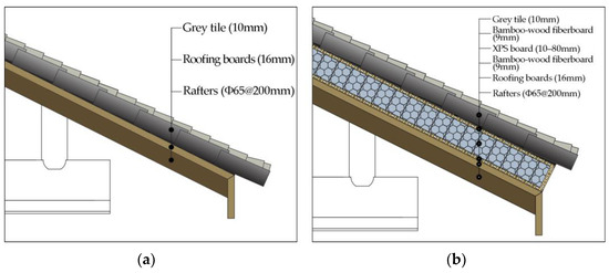 Most existing research on energy-saving retrofitting of traditional building souths concentrates on walls [7], windows [8], and floor slabs [9]. Although these components have a greater impact on the overall energy-saving of the building [10,11], retrofitting measures for the roofs are also crucial, especially for low-rise buildings. Roofs are the main surfaces that receive solar radiation and transfer indoor heat [12,13] and they account for 5–10% of the building’s total energy consumption and more than 40% of the top attic floor’s energy consumption in the hot summer and cold winter zone of China [14]. In southern China’s rural areas, roofs retrofitted with the same insulation material as walls have 2.3 times higher energy-saving efficiency than walls [15]. Most roofs of wood-structured traditional dwellings in China are sloped structures with cedar beams, boards, ceramic tiles, and other materials that have high heat transfer coefficients and low thermal insulation. Retrofitting these roofs can improve the indoor environment and energy-saving efficiency.
