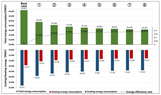 To evaluate the impact of various roof retrofit techniques on traditional residential energy use, this study used Grasshopper energy simulation software. This software was used to calculate energy consumption for the base case and for eight roof retrofit methods. The total energy consumption includes cooling energy, heating energy, equipment energy, and lighting energy, as shown in Figure 13.