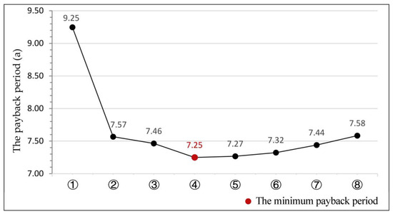 The inhabitants in this area have limited time for heating during the winter due to the local economic conditions and their living patterns. As a result, the annual energy consumption for cooling exceeds that of heating. The payback durations for the eight energy-saving retrofit methods are displayed in Figure 14. These periods vary from 7.25 to 7.58 years for all thicknesses of XPS board retrofit methods, except for the 10 mm XPS board retrofit method, which has a payback period of 9.25 years. Therefore, this study suggests that local residents can choose appropriate retrofitting methods based on their specific circumstances.