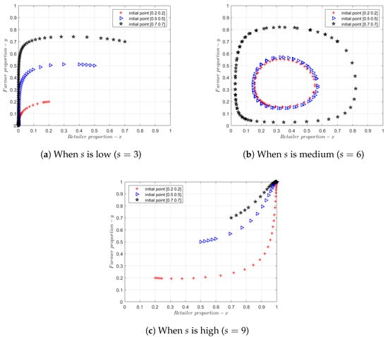 First, we analyze the simulation results without government subsidies. We set the parameter values: , , , , and , which satisfy Proposition 1 (i). As illustrated in Proposition 1 (i), Figure 1a shows that when the social responsibility premium s is low, all retailers would not help farmers and all farmers would choose to produce conventional products. We set the parameter values , , , , and to depict the result of Proposition 1 (ii). As Figure 1b indicates, when s is medium, dynamic system (1) has no asymptotically evolutionary stable point and the graph presents a closed loop around the central point , . Finally, in Figure 1c (we set the parameter values: , , , , and ), the result is that all retailers adopt the help strategy and all farmers adopt the organic strategy, which is illustrated in Proposition 1 (iii).