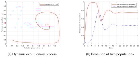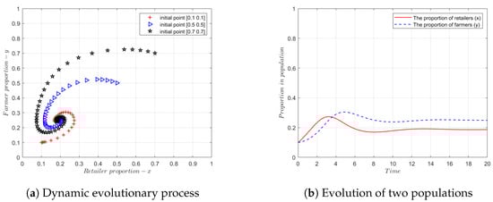 In this section, we utilize Matlab R2022a for numerical simulation to further illustrate the findings. We will not only show the trends of retailers and farmers’ strategy selection in different scenarios, but also observe how changes in parameters affect various players.