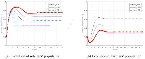To bolster organic agriculture, numerous governments are offering financial incentives for organic farming. Financial support is extended to farmers to foster organic agriculture and sustainable farming methods. For instance, the Chinese government has earmarked approximately 20 billion CNY for agricultural funds aimed at decreasing green agriculture production costs and encouraging green growth in the sector []. In India, through the Paramparagat Krishi Vikas Yojana (PKVY) and Mission Organic Value Chain Development for North Eastern Region (MOVCDNER) schemes, farmers receive financial aid of about INR 30,000 per hectare over three years for organic inputs, including seeds, bio-fertilizers, bio-pesticides, organic manure, compost/vermi-compost, and botanical extracts []. The provincial government of Bali, Indonesia, has introduced subsidies for organic fertilizers, starting with an annual fund of EUR 69.7 million, which is anticipated to increase annually to lower the costs of organic farming for farmers []. Conversely, certain governments provide subsidies to retailers to incentivize them to support farmers and market organic products. For example, the Canadian Agricultural Partnership has laid robust groundwork by offering subsidies to food processors to enhance organic agriculture []. Similarly, the EU’s Common Agricultural Policy has contributed to the growth of organic production by financing retailers for the marketing and promotion of organic items []. This leads us to explore several questions: Should the government provide subsidies to farmers or retailers? What are the different impacts of subsidies to farmers and retailers on the development of organic agriculture? What is the evolutionary trend of the behavior of farmers and retailers? How does the amount of government subsidies affect organic agriculture?