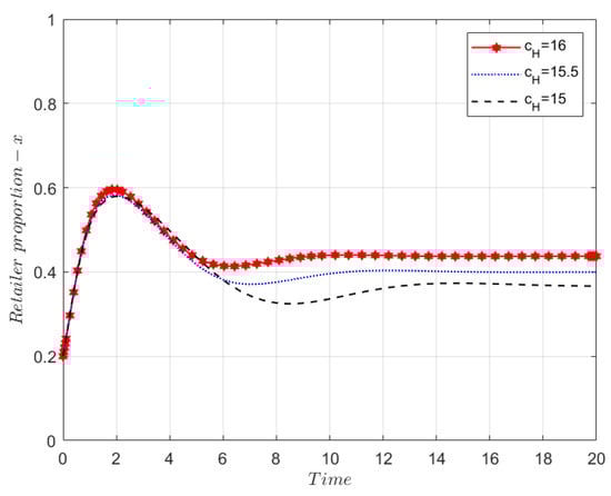 If retailers sell conventional products, they obtain revenue . Conversely, if retailers sell organic products, they obtain revenue , where q is the price premium that consumers pay for organic products [,]. Retailers can choose whether to help farmers. Sharing production costs is a common method to help consumers [,]. If retailers help farmers, they bear k percentage of farmers’ production costs, and consumers are willing to pay a premium s for retailers’ social responsibility (social responsibility premium) [,]. Define x as the share of retailers implementing a support strategy. Accordingly, the share pursuing a strategy devoid of assistance is denoted by .