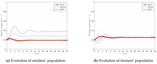 Then, we conduct a sensitivity analysis for the asymptotically stable equilibrium . Proposition 7 analyzes the impact of the organic production cost , the percentage k of production costs that retailers bear, and the maximum government subsidies G on the retailers’, farmers’, and governments’ decisions.