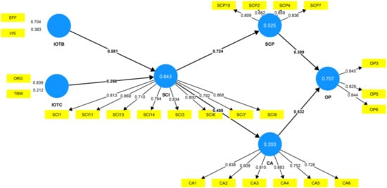 Table 3 displays the hypothesized model. This step involved assessing factor loadings, with values above 0.708 considered acceptable as they explain over 50% of the indicator’s variation, indicating adequate item dependability [76]; all items and indicators exceeded 0.50. Furthermore, the VIF values were below the threshold of 5 [78]. Several items, including ORG4; SCI2, 4, 5, 8, 10, 12, and 15–17; OP 1.2.4. and 7; SCP1, 3, 5, 6, 9, and 8–14; TRW 1.4.6; and VIS1, 2, and 4, were removed from the model based on their high VIF values to mitigate multicollinearity.