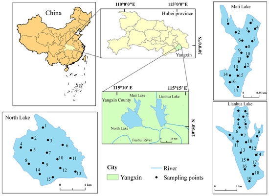 Situated in the southeast of Hubei Province, in the middle reaches of the Yangtze River (114°43′~115°30′ E, 29°30′~30°09′ N), Yangxin County features numerous shallow lakes (Figure 1). Considering geographical location, nature, type, and importance, Lianhua Lake, Mati Lake and North Lake were chosen as representative lakes for this study. The region experiences a subtropical monsoon climate, characterized by cold winters and hot summers. with an average annual temperature of 16.8 °C. The central urban area has a population of 204,800.