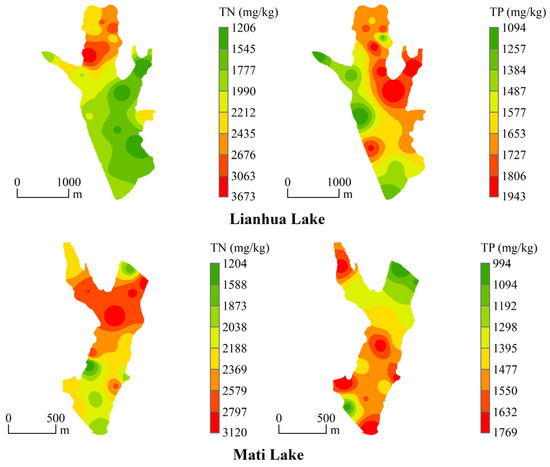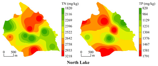 Spatial distributions of TN and TP contents in the surface sediment. The interpolation map illustrates the variations in nutrient content across the lake.