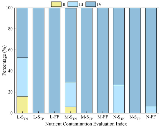 Evaluation of the single pollution index of sedimentary nutrient salts. Evaluation of variations in STP, STN, and FF among lakes. The graphical representation of changes in the proportion of pollution levels intuitively reflects the overall pollution status of each lake. TN TP pollution deserves more attention compared to TP TN pollution. Abbreviations: L, Lianhua Lake; M, Mati Lake; N, North Lake; STN, single pollution index of TN in the sediments of lakes; STP, single pollution index of TP; FF, comprehensive pollution index of nutrients.