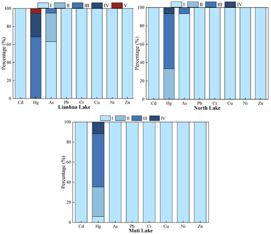 Table 6 illustrates that Hg had a relatively high ecological risk in Lianhua Lake, Mati 271 Lake, and North Lake, with ecological contribution rates of 63.3%, 62.9%, and 58.9%, respectively. The value for As in the sediments of Lianhua Lake was 30.16, indicating a moderate ecological risk. The individual values of the HMs in the three lakes were generally consistent, with the most significant pollution arising from Hg, followed by As. Other elements in each lakes exhibited low individual , emphasizing that Hg and As are the primary contributors to ecological hazards in the surface sediments in the studied lakes.