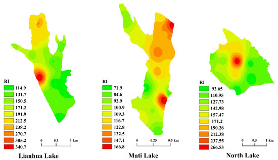 Spatial distribution of the potential of HMs in the sediments of typical lakes in Yangxin County. RI, comprehensive potential for HMs.