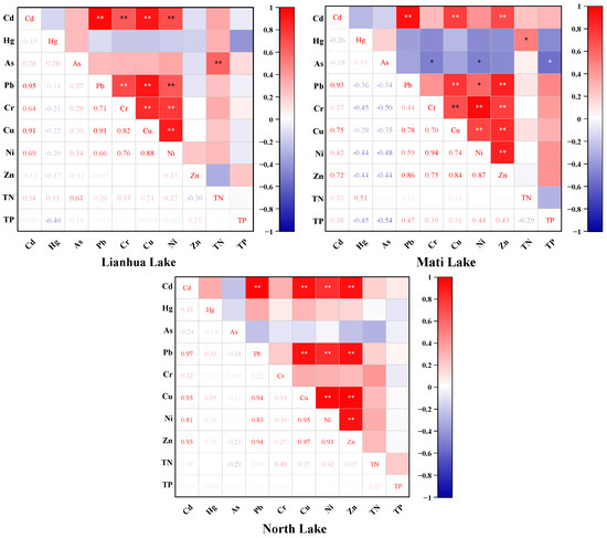 Pearson’s correlation between nutrient salts (TN and TP) and HMs present in the surface sediments in Lianhua Lake, Mati Lake, and North Lake. TN, total N; TP, total P. Note: * p < 0.05; ** p < 0.01.