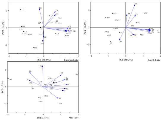 In Lianhua Lake, the two first axes explained 64.0% of the total variance. Additionally, there was a significant correlation (p < 0.01) between Cu, Pb, and Cr, indicating similar spatial patterns. High concentrations of HMs in Lianhua Lake were mainly distributed in the southern and northwestern parts of the lake. In Mati Lake and North Lake, Zn had a higher loading in PC1, suggesting a relatively consistent source of HMs in these three lakes, potentially originating from natural sources or similar anthropogenic activities like mining and traffic emissions.