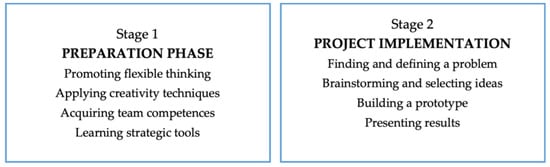 Stage 2 is an activity-based project lesson in which young people apply the content and skills they have learned from Stage 1 and take on a real SDG challenge. The aim here is for students to go through all the phases of a creative process and acquire strategies for planning and implementing a project (see Section 2.2.5)—from problem identification and problem definition, brainstorming, and idea selection to the development and pitching of a prototype in the best-case scenario, even up to the actual implementation of the idea.