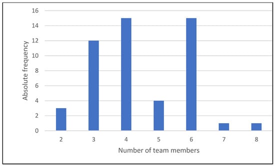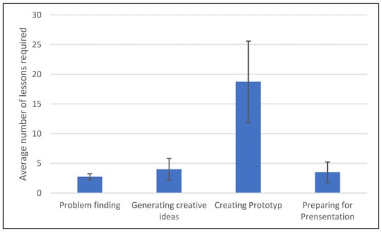 The results regarding the time units spent on the entire program were interesting. The teams used an average of 5.5 teaching units for the first stage of the program—to teach the SDGs, getting to know the techniques, and for general training in divergent thinking. The 62 teams required an average of 29 teaching units for the second stage of the program—to work on a specific project as part of the challenge, from brainstorming to developing a prototype.