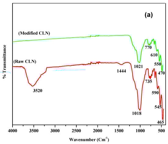 For the natural and modified CLN, the percentage of transmittance (%T) was measured using a FT-IR spectrophotometer (model mentioned in Section 2.4.1). The threshold was set at zero for maximum peak detection. The FT-IR spectra of the raw CLN and modified CLN are displayed in Figure 2a. The bands in the range of 1100 to 400 cm−1 may be assigned to the aluminosilicate structure of the material. The bands in the range of 850 to 700 cm−1 are due to the symmetric stretching vibrations of quartz or amorphous SiO2, while those in the range of 600 to 400 cm−1 are due to the bending vibrations of Si–O–Si. The intensity of this band varied from sample to sample, indicating that the superimposition from the bands attributed to amorphous materials and/or exchangeable cations is a possibility. However, bands between 420 to 300 cm−1 may be observed due to pore opening vibrations and 650 to 500 cm−1 may because of double-ring vibrations [24,26].