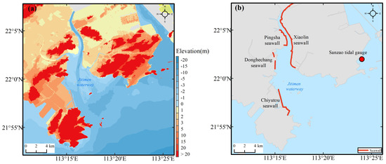 Geographic information data: These data include digital elevation model (DEM) data and coastal seawall data covering the study area. The DEM data (2021) have a spatial resolution of 10 m (Figure 1a), and the seawall data (2022) have a spatial resolution of 50 m. These data were collected mainly on both sides of the Jitimen estuary and east of the Gaolan Port, including the Xiaolin, East Pingsha, Donghechang, and Chiyutou seawalls (Figure 1b), with elevations in the range of 2.6 to 4.2 m (Pearl River datum; the same below).