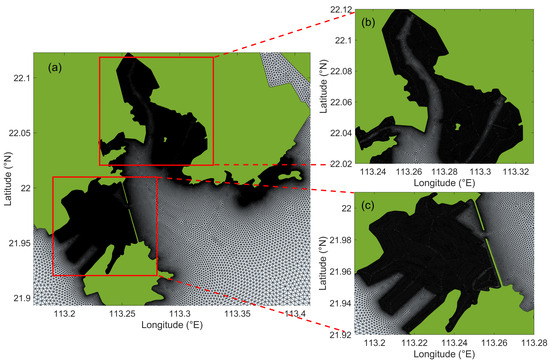 The storm surge model uses an unstructured triangular grid to describe complex nearshore terrain. The calculation region includes most of the South China Sea, with an open-boundary grid resolution of 20 km. The grid is refined in the study area. The land grid has a resolution of 30–40 m, and the Jitimen channel grid has a resolution of 50–100 m. The entire set of grids consists of 345,926 grid cells and 177,053 grid points, with approximately 70% of the grid cells distributed on the land and in the channels of the study area. An 8 m land contour is used as the land boundary. Figure 2 shows the grid distribution in the overall study area and in the key regions.