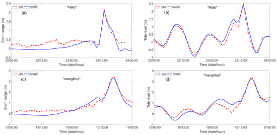 Comparison of the measurements and simulated hindcasts for the Sanzao tide gauge station: Storm surge of Hato (a), total tide level of Hato (b), storm surge of Mangkhut (c), and total tide level of Mangkhut (d).