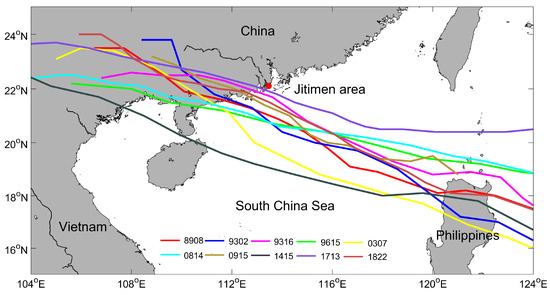 Paths of the typhoons that caused the top ten historical tide levels at the Sanzao tide gauge.