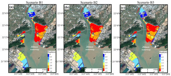 Comparison of the storm surge inundation areas and depths under the three scenarios of the typhoon landfall intensity scheme: scenario B1 (a), scenario B2 (b), and scenario B3 (c).