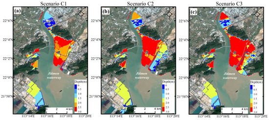 Comparison of the storm surge inundation areas and depths under the three scenarios of the typhoon landfall direction scheme: scenario C1 (a), scenario C2 (b), and scenario C3 (c).