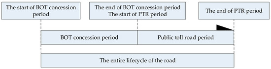 Consequently, the Chinese government has witnessed multiple BOT road contract expiration instances. In response to these expirations and as a strategy for carbon emission reduction, the Chinese transportation agency has opted to continue charging road users [4]. Based on the above description, when BOT roads are transferred from private firms to the government, and users continue to be tolled for using them, they are then referred to as PTRs [5,6,7]. When BOT roads become PTRs, whether they are repaired or not, the traffic operation strategies of PTRs then become new modes that are different from those of BOT roads. The road operation period starts a new period, defined as the PTR period. Table 1 outlines comparisons between BOT roads and PTRs.