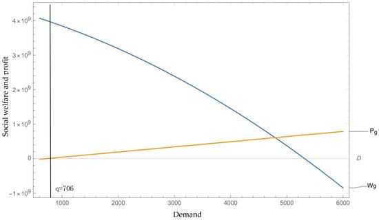 The derivative at means that capacity at can increase with demand increasing under Condition (62). Then, the private firm profit will increase, since is increasing similar to from the above analysis. From Equation (64), social welfare strictly increases from the value of as both profit and demand increase. This result contradicts the optimal assumption. Therefore, under government regulation , the private firm will select a PTR contract with and . Thus, the proposition is proved. □
