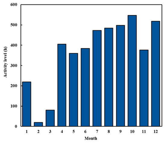 - Calculate the actual activity level. For non-road mobile machinery equipped with an onboard terminal OBD, once started, it is connected to the server through wireless communication, and the mechanical data are sent to the server every 30 s. Therefore, as long as the total number of data of a non-road mobile machine on the platform is counted, the actual activity level of the machine in this period can be calculated. The specific calculation formula is as follows:where m is the total number of data of the machine in the database within a certain period.