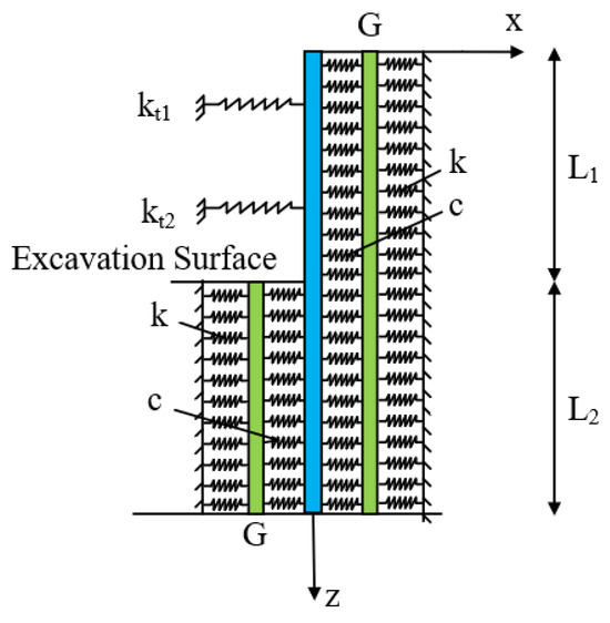 The soil on both sides of the diaphragm wall is equated to a spring, and the soil shear force is considered through the shear layer, the soil compression force through spring k and spring c, and the support force through kt. The calculation of soil pressure is based on static earth pressure, and it is stipulated that the positive horizontal displacement w of the diaphragm wall corresponds to the active deformation of the soil and that the negative horizontal displacement w of the diaphragm wall corresponds to the passive deformation of the soil. Therefore, when the active deformation of the soil occurs, the increment in the soil pressure is negative, and the increment in the internal support pressure is positive; when the passive deformation of the soil occurs, the increment in the soil pressure is positive, and the increment in the internal support pressure is negative.