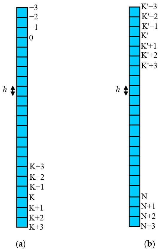 The finite difference method was employed to computationally solve the flexural differential equation of the shear layer by dividing the wall into n equal sections, where each section has a length of h. In this paper, h = 0.5 is assumed in the theoretical calculations. Three virtual nodes are added at the top and bottom of the wall, and the nodes from the top of the wall to the excavation face are numbered −3, −2, −1, 0, 1, 2, 3, …, K − 3, K − 2, K − 1, K; the nodes from the excavation face to the bottom of the wall are numbered K, K + 1, K + 2, K + 3, …, N − 3, N − 2, N − 1, N, N + 1, N + 2, and N + 3, as shown in Figure 3. K is the node at the excavation face, and N is the node at the bottom of the wall.