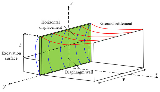 Excessive deformation caused by pit excavation leads to slope instability, which affects construction safety and is not conducive to the goal of sustainable development of a project. At present, research on the horizontal displacement of diaphragm walls caused by foundation excavation mainly includes field monitoring [1], model tests [2], theoretical calculations [3], and numerical simulations [4,5]. The existing theoretical studies mainly include the limit equilibrium method, elastic foundation beam method, and variational method. The limit equilibrium method is applicable only to rigid short piles with little burial depth, and the application range is relatively narrow. The variational method is based on the principle of minimum potential energy and calculates the horizontal displacement of diaphragm walls through energy relations, but its boundary conditions are demanding, and accuracy cannot be guaranteed [6].