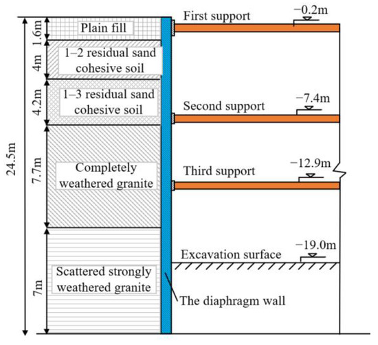 For the subway station in Xiamen, the diaphragm wall is made of C30 concrete with a depth of 24.5 m and a thickness of 1000 mm. The first is a concrete support, with a horizontal spacing of 5 m and an elasticity modulus of 30 GPa; the second and third supports are = 609, with t = 16 mm steel support, a horizontal spacing of 5 m, and an elasticity modulus of 200 GPa. The foundation support form is shown in Figure 8.