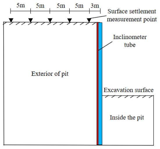 According to the monitoring program of this project, the horizontal displacement is monitored by the inclinometer tube, which is laid along the depth direction of the whole diaphragm wall. The surface settlement is monitored by a level meter, and the monitoring points are set at 3 m, 8 m, 13 m, 18 m, and 23 m from the diaphragm wall, as shown in Figure 9 for the field measurement point layout.