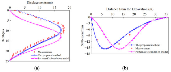 The calculation results of comparing the theoretical calculation and the two-parameter Pasternak model with the actual measured data in the field to verify the rationality of the theory of calculating the horizontal displacement are shown in Figure 10a. The results show that the theoretical calculation results based on Kerr’s three-parameter model in this paper are more accurate and closer to the field monitoring results compared with the theoretical calculation results of Pasternak’s two-parameter model. The maximum horizontal displacement calculated by the two theories is 17.13 mm and 16.99 mm, respectively, which are very close to each other. However, the development trend of the horizontal displacement varies greatly, and the theoretical calculation results of the three-parameter Kerr model are more accurate compared with the monitoring results. As for the depth of the maximum horizontal displacement, the Kerr model’s value was calculated to be 9.5 m, and the Pasternak model’s value was calculated to be 11.5 m. The Kerr model’s value is closer to the field data, which proves that the three-parameter Kerr model has a better calculation accuracy.
