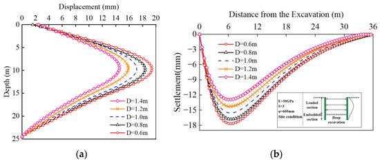 Deformation curves of foundation pit with different thicknesses of diaphragm wall: (a) influence of D on horizontal displacement; (b) influence of D on settlement.