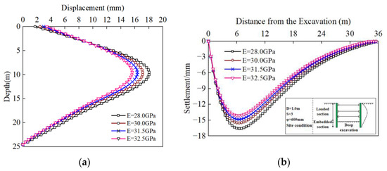 Deformation curves of foundation pit with different elastic moduli of diaphragm wall: (a) influence of E on horizontal displacement; (b) influence of E on settlement.