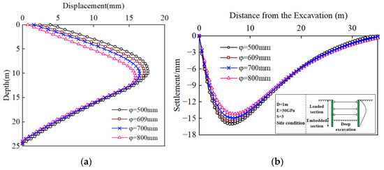 To analyze the influence of the diameter of the internal support on the horizontal displacement of the diaphragm wall, four working conditions were set up, with the diameter of the second steel support as the representative. The diameters of the internal support were taken as φ = 500 mm, φ = 609 mm (consistent with the field), φ = 700 mm, and φ = 800 mm to analyze the influence of the change in the stiffness of the internal support on the horizontal displacement of the diaphragm wall and surface settlement with different diameters. Figure 13 shows the horizontal displacement curves and surface settlement curves with different diameters of the internal support, respectively.