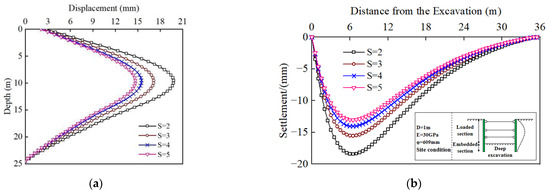 Deformation curve of foundation pit with different numbers of internal supports: (a) influence of S on horizontal displacement; (b) influence of S on settlement.