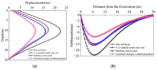 According to the properties of the soil layer, four working conditions are set up: the site soil layer, 1–2 residual sandy clay soil, scattered strongly weathered granite, and medium coarse sand. The medium coarse sand layer weight is 17.7 , the cohesion is 24 kPa, the internal friction angle is 21°, the compression modulus is 7.53 MPa, and Poisson’s ratio is 0.25. Figure 15 shows the displacement of the diaphragm wall and surface settlement curves in different soil layers.
