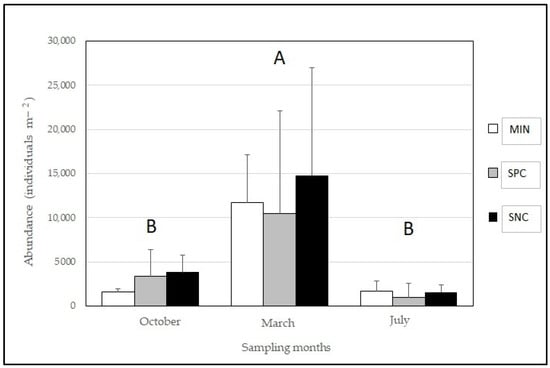 The presence of the two main species, O. excavata and T. sarekensis, varied with time (Table A4); they followed the total abundance trend (Figure 1). The highest values were in the March sampling period. There were no differences between the other sampling periods (October and July). The presence of A. ardua did not show significant differences with time or between treatments. As a result, in March, the presence of A. ardua was significantly lower than that of O. excavata and T. sarekensis (Table A5). The values in March 2019 were 1336, 4637 and 6013 individuals m−2 for A. ardua, O. excavata and T. sarekensis, respectively.