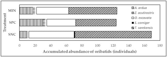 Three main species were identified (Figure 2): Acrotritia ardua americana (Ewing, 1909), Oribatula (Zygoribatula) excavata Berlese, 1916 and Tectocepheus sarekensis Trägårdh, 1910. Another two species were present: Scapheremaeus corniger (Berlese, 1908) that can be considered an outsider as only one individual was found, and Zetomimus (Protozetomimus) acutirostris (Mihelčič, 1957) with less than a total of five individuals present in each treatment and in different samplings.