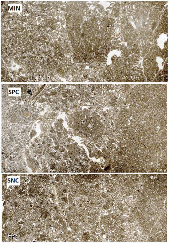 Representative scanned images from the thin sections used for microstructure description, according to the different treatments: MIN (mineral fertilization), SPC (soil P criterion using sludges), and SNC (sludge N criterion).